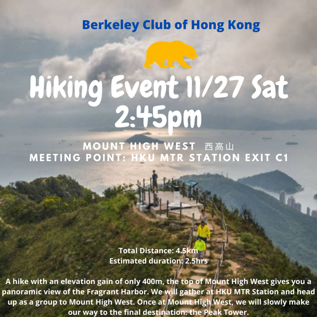 Given the beautiful weather, the Berkeley Club of Hong Kong is organizing a hike on Saturday, November 27 to Mount High West. Grab your friends/family and join us in hitting the trails to see the great outdoors! Enjoy spectacular views of the Fragrant Harbor as you hike alongside friends (new and old!) up towards High West. The total distance is around 4.5km with only 400m of elevation gain, perfect for all. The hike will end at the Peak Tower where everyone can grab some refreshments and take their preferred form of transportation back down.